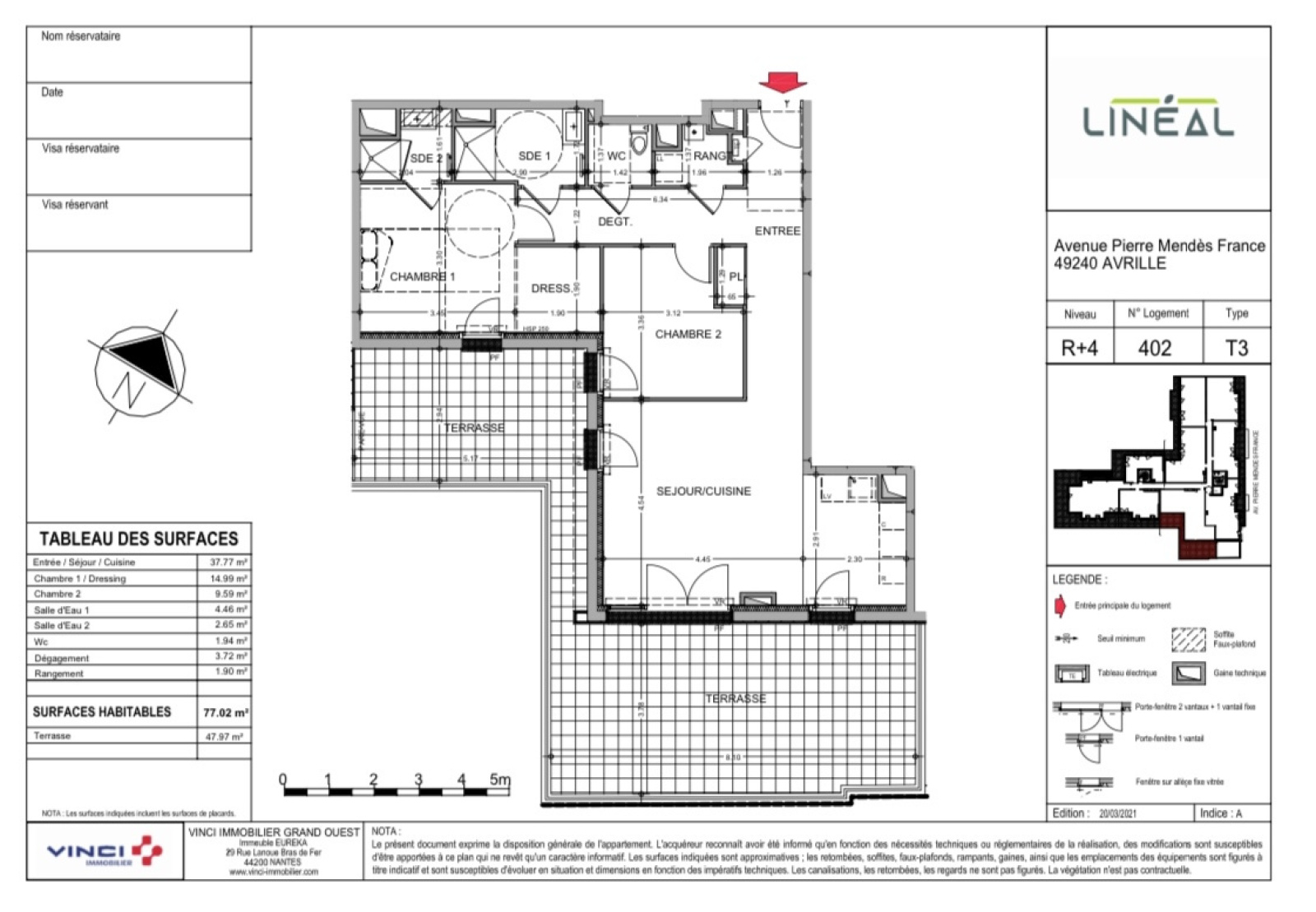 Découvrez l'opportunité unique d'acquérir un appartement neuf de standing dans une résidence de qualité, idéalement située au cœur de la ville-parc d'Avrillé. Ce T3 de 77.02 m², bénéficiant d'une exposition sud optimale, sera livré au 4ème trimestre 2025 et offre un cadre de vie privilégié.